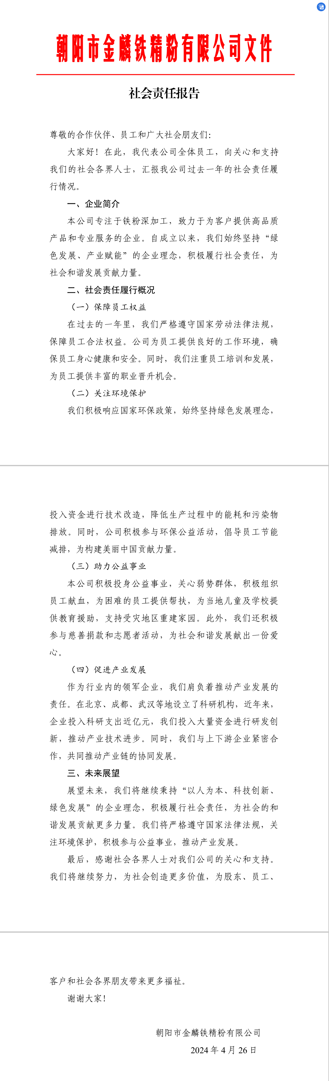 大家好!在此,我代表公司全體員工,向關(guān)心和支持我們的社會各界人士,匯報我公司過去一年的社會責任履行情況。